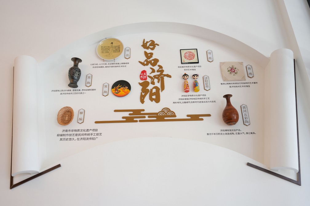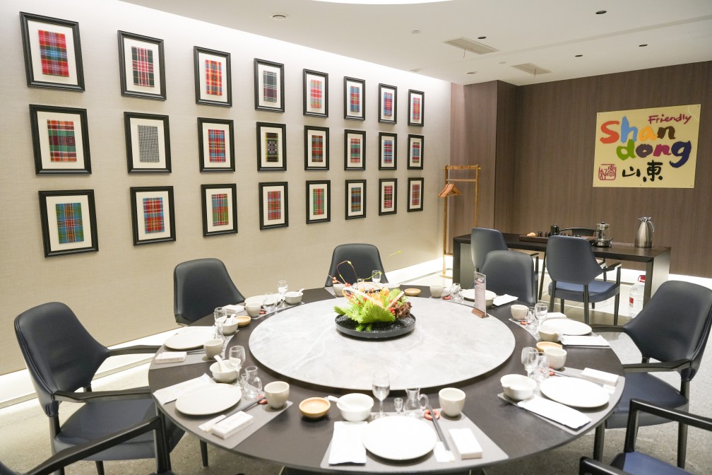 獨(dú)具匠心之處在于,一品黃河20個包間以黃河所流經(jīng)的九個省份和進(jìn)入山東省后所流經(jīng)的九個市的名稱命名,房間內(nèi)軟裝如掛畫等體現(xiàn)沿黃省份、城市的文化特征,并通過桌卡形式全面呈現(xiàn)文化內(nèi)涵,將黃河文化具象為沉浸式餐飲體驗。比如山東廳懸掛的是山東具有代表性的非遺文化代表作--魯錦,魯錦的每一梭都是對自然的敬畏,每一紋都是對生活的期許;黃河源頭青海廳懸掛的是青海省具有代表性的非遺文化代表作熱貢唐卡;四川廳懸掛的是四川具有代表性的非遺文化代表作蜀繡做成的熊貓壁畫;有“天下黃河富寧夏”之說的寧夏廳,懸掛的是寧夏最具代表性的非遺文化產(chǎn)品回民剪紙等等。讓每一餐都成為一場文化之旅。