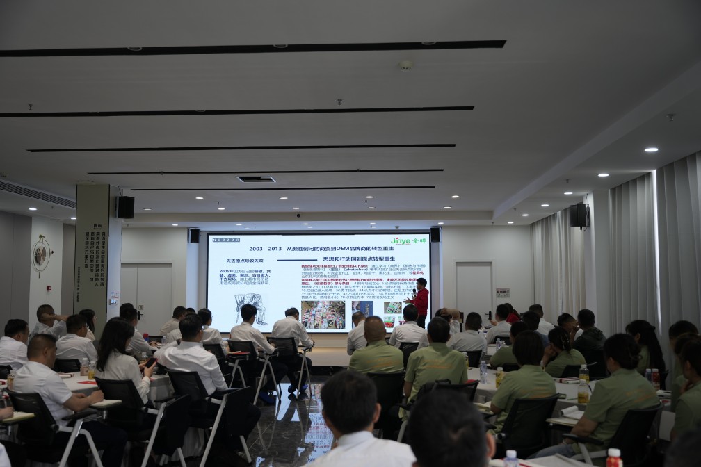 參觀結(jié)束后,眾人齊聚會(huì)議室,參加由金曄食品創(chuàng)始人李金倫主講的學(xué)習(xí)交流會(huì)。在分享中,李總以“回歸原點(diǎn)創(chuàng)造美好”為主題,結(jié)合金曄的成長故事,深入闡釋了企業(yè)如何將稻盛經(jīng)營學(xué)融入日常經(jīng)營,如何把“敬天愛人”的理念落地生根,深入淺出地分析了當(dāng)前食品行業(yè)的發(fā)展趨勢(shì)和挑戰(zhàn),并分享了企業(yè)如何在市場競爭中堅(jiān)守初心、不斷創(chuàng)新的重要性。他講到,回歸原點(diǎn)就是回歸簡單純粹和真誠善良,人生和經(jīng)營的成功無非是回歸原點(diǎn)的行動(dòng)。他強(qiáng)調(diào),企業(yè)需將哲學(xué)思維(如稻盛和夫理念)與實(shí)戰(zhàn)管理(如華為流程優(yōu)化)融合,形成獨(dú)特的經(jīng)營體系。他還提出用戶導(dǎo)向,通過“空椅子”機(jī)制讓用戶虛擬參與決策,分歧時(shí)優(yōu)先遵循用戶立場;首創(chuàng)無添加山楂制品,以包裝革新(自立袋、拉鏈設(shè)計(jì))提升體驗(yàn);拆分職能部門為“傳統(tǒng)+現(xiàn)場”雙線,推行阿米巴模式激發(fā)團(tuán)隊(duì)自主性。李總對(duì)企業(yè)使命的解讀、對(duì)員工關(guān)懷的重視、對(duì)讀書學(xué)習(xí)的熱愛和感受,以其豐富的經(jīng)驗(yàn)和獨(dú)到的見解,讓與會(huì)者深受啟發(fā),進(jìn)一步認(rèn)識(shí)到企業(yè)文化與價(jià)值觀在企業(yè)發(fā)展中的核心作用。