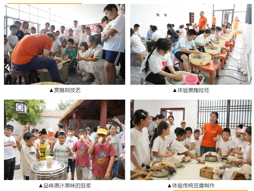 在課程研發(fā)中,基地主導(dǎo)打造“陶藝匠心”“非遺工坊”等特色項(xiàng)目,將濟(jì)陽黑陶制作、傳統(tǒng)手工藝等非遺技藝融入教學(xué),讓傳統(tǒng)文化“可觸摸、可參與”。例如,在“陶藝匠心”課程中,學(xué)生可觀生產(chǎn)工藝、賞雕刻技藝和拉坯表演,更能親手制作黑陶器皿,感受黃河流域陶藝文化的千年底蘊(yùn);“古法豆腐”研學(xué)課程中,深入挖掘傳統(tǒng)豆腐制作工藝,讓學(xué)生親手參與從選豆、泡豆、磨漿、煮漿到點(diǎn)鹵、壓模的全過程,在實(shí)踐中體會(huì)傳統(tǒng)工藝的魅力。